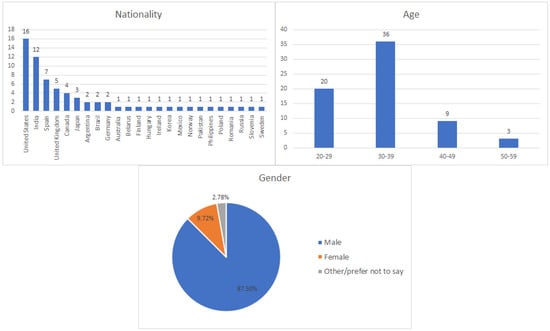 A total of 72 people from 24 countries worldwide completed the questionnaire. As shown in the left chart of Figure 5, the ordered list of participants’ countries is the following: United States, India, Spain, United Kingdom, Canada, Japan, Argentina, Brazil, Germany, Australia, Belarus, Finland, Hungary, Ireland, Korea, Mexico, Norway, Pakistan, Philippines, Poland, Romania, Russia, Slovenia, and Sweden. From a demographic perspective, the participants’ ages are distributed from 21 to 53 years old, being the thirties the more numerous group, which accounts for the 52.94% of the total participants. Regarding gender, the respondents were 87.5% men, 9.72% women, and 2.78% chose the option “other/prefer not to say”.