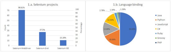 Figure 6 presents the resulting charts for the first section of the survey. Regarding the use of Selenium projects, we check that clearly, Selenium WebDriver is the most utilized project, since 71 out of the total participants, that is, 72, declared to use Selenium WebDriver. This number implies a usage quota of 98.61% for Selenium WebDriver. Additionally, 27 respondents (37.5% of the total) declared to use Selenium Grid as well. Finally, we find that Selenium IDE was selected 11 times in the survey (15.28%). Regarding the preferred programming language used in Selenium scripts, Java is the preferred by the 50% of the participants. Then we find Python (18.06%), JavaScript (13.89%), C# (12.5%), Ruby (2.78%), and finally Groovy and PHP (1.39% each one).