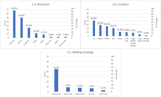 In the second section of the survey, we investigate several fine-grained details of the test design and implementation. Regarding browser usage, as illustrated in Figure 7, we check that Chrome is the most used since it was selected by 68 out of the 72 participants. This number is equivalent to a very relevant usage quota of 94.44%. The second browser is Firefox, selected 50 times in the questionnaire, that is, 69.44%. The third browser in terms of Selenium automation is Internet Explorer. It was chosen by 25 participants, which is equivalent to a rate of 34.72% of the participants). The rest of the browsers are Edge (11 usages, 15.28%), Safari (8 usages, 11.11%), and finally, Opera, HtmlUnit, and PhantomJS (these three with a small quota of 2.78%). The right chart of Figure 7 illustrates the results of the locator strategy. The top strategies are by id, name, XPath, and CSS (chosen by a total percentage of 56.94%, 40.28%, 36.11%, and 29.17% of the respondents, respectively). It is worth noting that only 12.5% of respondents indicated they are using the POM pattern, which is a recommended practice to reduce maintenance costs and build more robust tests. Similarly, more than 36% of respondents use XPath expressions as locators, which, when not used properly, is considered a bad practice that tends to make tests unreliable []. The bottom chart of Figure 7 shows the results of waiting strategies. We check there is a clear preference for implicit waits, selected by 62.5% of participants. The second alternative is the use of explicit waits (12.5%). The third option is implementing manual wait strategies (e.g., Thread.sleep() in Java) with a quota of 11.11%. Then, we find no wait strategy (9.72%), and finally, fluent waits (4.17%).