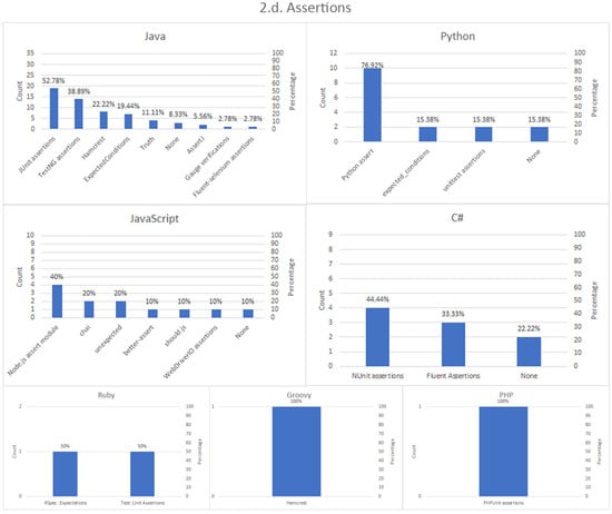 The last question of this section is related to the assertion within the Selenium tests. In light of the results, the assertion strategy is quite heterogeneous. To get a clearer picture of the results, Figure 8 illustrates the reported assertions grouped by the different Selenium language bindings (Java, Python, JavaScript, C#, Ruby, Groovy, and PHP). In Java, the most relevant assertion technologies are directly related to the underlying unit testing framework: JUnit and TestNG assertions, with a relative percentage usage (respect to the total participants using Java as its preferred language) of 52.78% and 38.89% respectively. Concerning Python, the preferred assertion method is the native modules for assertions, with a quota of 76.92%. Similarly, we highlight the native assertions module in Node.js when using JavaScript as language binding, with a 40% quota. When coming to C# as language binding, we find NUnit assertions and Fluent Assertions, with 44.44% and 33.33%, respectively. In Ruby, there are different options in the two provided answers: RSpec::Expectations and Test::Unit Assertions. Finally, we find Hamcrest for Groovy and PHPUnit assertions for PHP.