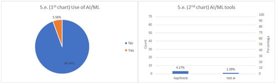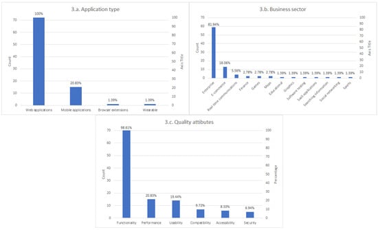 When coming to the third section of the survey about the SUT, we find the following. Regarding the application type, as shown the left chart of Figure 9, all the participants declared to test web applications (100%). Besides, 20.83% of the respondents reported testing also mobile applications (using Appium, as shown in Section 4.5). A small percentage of participants chose other options: browser extensions and wearables, both with 1.39%. Regarding the business sector, there is a clear preferred option, the enterprise applications, with a quota of 81.94%. The second and third options are e-commerce and real-time communications (WebRTC), with 18.06% and 5.56%, respectively. Comparatively, the other options have a minor impact: finance, games, maps, educational, graphics, software testing, Software as a Service (SaaS) applications, searching applications, social networking, and finally, sports. Regarding quality attributes, functional testing is the majority option, chosen by 98.61% of the respondents. Then we find performance (20.83%), usability (19.44%), compatibility (9.72%), accessibility (8.33%), and security (6.94%).