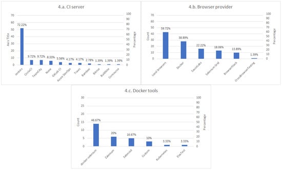The fourth section of the survey is about the infrastructure for Selenium tests. In this section, we asked a question about the CI server used in conjunction with Selenium. In this aspect, as shown in the left chart of Figure 10, Jenkins CI (https://www.jenkins.io/) is the preferred option, selected the 72.22% times by the respondents. Regarding the provider for the browser used by Selenium, we can categorize the answers in different groups: