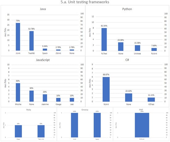 The fifth section of the survey is about other testing frameworks used together with Selenium. This first question of this category is about unit testing frameworks. We found a relevant number of different answers to this question in the survey. For the shake of clarity, the selected unit frameworks by respondents are grouped by the programming language in Figure 11. In Java, we check that there are two major unit frameworks: JUnit (75%) and TestNG (52.78%). In Python, the preferred option is PyTest (61.54%). Mocha was selected by half of the participants using JavaScript. NUnit is the preferred option by C# users (66.67%). The two respondents who declared to use Ruby used RSpec and Test::Unit as unit frameworks, respectively. In Groovy, the only respondent uses two different unit frameworks: JUnit and Spock. And finally, PHPUnit is used by the unique person using PHP in this survey.