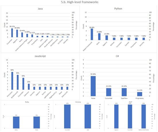 Regarding high-level frameworks based on or extending Selenium, the situation is also heterogeneous. As illustrated in Figure 12, we find several frameworks for different languages, namely: