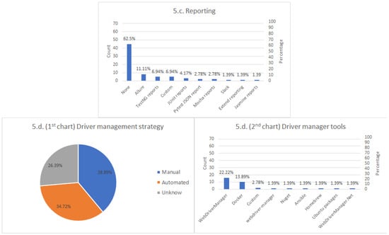 In the third question of this section, we study the reporting tools used with Selenium. The top chart of Figure 13 shows these results. An option stands out respect to the others: none, with a quota of 62.5%. This option means that no report tools are used, and simply the test output is used instead. The second option is Allure (http://allure.qatools.ru/), with 11.11%. It is relevant to mention that this tool was selected even using different language bindings: Java, JavaScript, and Python.