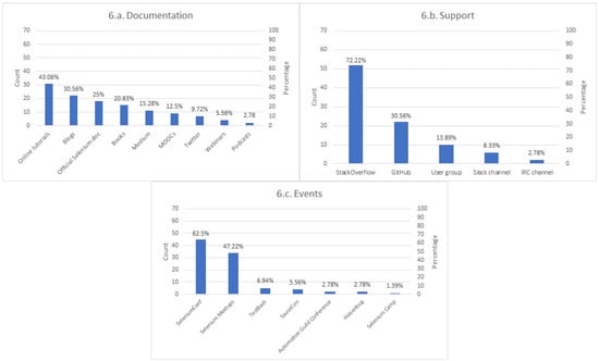 The sixth section of the survey comprises aspects related to the Selenium community. The first question is about the preferred sources of information to learn and keep updated about Selenium (i.e., documentation). The second question surveys about the most convenient ways to obtain support about Selenium from the community. The last item of this section asks the participant to report relevant events related to Selenium, such as SeleniumConf or the Selenium Groups.