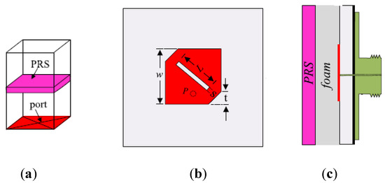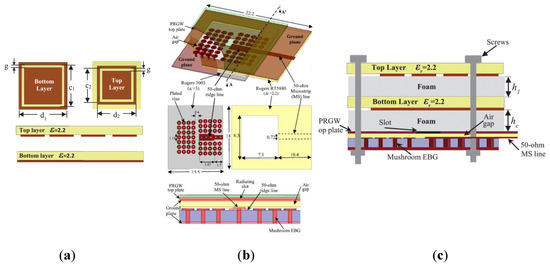 Configuration of a wideband RCA along with a PRS with positive reflection phase: (a) Unit cell of PRS; (b) Main radiating element (PRGW); (c) Entire structure [65].