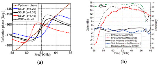 (a) Reflection phase of the PRS unit cell; (b) Measured and simulated gain and efficiency of the RCA in [65].