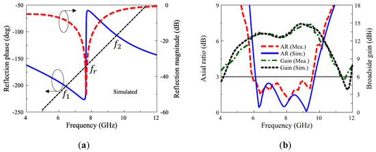 (a) Reflection phase and magnitude of the PRS unit cell; (b) AR and gain. [67].