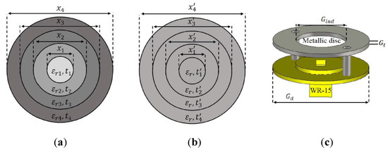 Recent investigations with stepped configurations have been done in millimetre wave frequency band to increase the antenna bandwidth [32,73,74], which shows the flexibility of RCAs for different frequency bands. In Reference [74], the application of two different non-uniform PRS structures to enhance the 3-dB gain bandwidth and maximum gain of the RCA are investigated over the MMW spectrum. The first PRS is composed of a four concentric full dielectric rings of different permitivity and thickness, whereas the second PRS is made of a single laminate substrate with the same permitivity and different thicknesses. Both of the PRS structures have an stepped configuration, and an open-ended WR-15 waveguide is used as the main radiator inside the cavity to feed the antenna. The antenna structure without PRSs and PRS prototypes are demonstrated in Figure 5. The antenna with the second PRS has a maximum measured gain of 19.5 dBi with a proper matching from 55.2 GHz to 65 GHz. The simulated and measured results are displayed in Figure 6. These kinds of non-uniform PRS structures achieve remarkable gain-bandwidth product (GBP), which is a true merit used in the comparison between different antennas. The proposed antenna in [74] has a simple structure with a high gain and low cross-polarization, which makes it beneficial for base stations, point-to-point communication systems, autonomous radars, remote sensing satellites, and Internet of things (IoT).