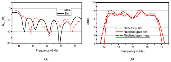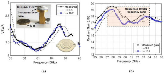 Simulated and measured results of RCA with stepped PRS: (a) VSWR; (b) Gain [74].