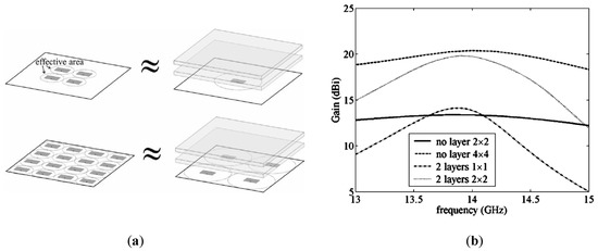 Using array antennas instead of single main radiator inside the cavity structure is another conventional method to increase the 3-dB gain bandwidth. This idea has been investigated in many studies [27,33,43,80], which mostly used complicated feeding networks. In Reference [43], an array of patch elements are used as the radiators. Besides, by adding two PRS layers above the array antennas, the radiation performance of the antenna is improved. The antenna configuration and the results of the antenna gain are demonstrated in Figure 9. As can be seen, the maximum gain of a 2 × 2 array patch antenna without any PRS layer is almost the same as a RCA with a single patch as the main radiator. Similarly, the results are same for a 4 × 4 patch array without PRS and a RCA with a 2 × 2 patch array as the main radiator.