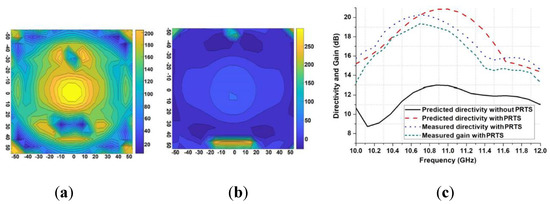 In Reference [82], an stepped superstrate is used to compensate the non-uniform aperture phase distribution of a RCA, which leads to a higher directivity and aperture efficiency. The structure is a phase rectifying transparent superstrate (PRTS), which was fabricated by 3-D printing technology and the main radiating element is a microstrip patch antenna with a full-dielectric PRS structure illustrated in Figure 10. Figure 11 shows the phase distribution and the directivity of the antenna, before and after applying PRTS structure. As can be seen, the phase distribution becomes almost uniform all over the aperture, since the PRTS placed above the PRS compensates the phase delay. According to the Figure 11c, the directivity gets a significant improvement when that the PRTS is placed above the entire RCA structure.