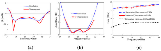 Measured and simulated results of the CP RCA reported in [42]: (a) Reflection coefficient; (b) AR; (c) Gain.