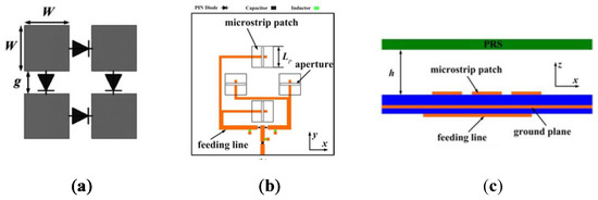Configuration of a RCA with dual-reconfigurability feature: (a) Unit cell; (b) Main radiator; (c) Entire RCA structure [140].