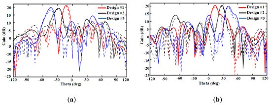 In References [139,146], the possibility of using RCA with reconfigurable pattern characteristic for 5G is illustrated. In Reference [139], the beam tilting of a RCA is investigated through four different techniques at 60 GHz. The techniques used for tilting the beam include wedge-shaped dielectric lens (WSDL), discrete multilevel grating dielectric (DMGD), printed gradient surface (PGS), and perforated dielectric gradient surface (PDGS), which are based on the phase gradient surface method. Among the mentioned techniques, PGS and PDGS have better performance inorder to provide reconfigurability feature. Figure 16a shows a printed ridge gap waveguide (PRGW) used as the main radiating element in [139]. Six different structures of the PGS and PDGS were proposed and their functionality is investigated while they are placed above the main radiator. Three designs #1, #2, #3 for PGS and PDGS structures were done for different tilt angles. A maximum gain of around 22 dBi is achieved when these structures are used to tilt the beam of the RCA. The simulated and measured results achieved by using these six superstrates are illustrated in Figure 17. As shown, the tilted beam angles of , and are achieved by placing every design of PGS or PDGS above the main radiator. The proposed antenna in [139] is a potential candidate for narrow-band communication systems. It can be used in mobile devices due to its compact configuration with reconfigurable radiation pattern.