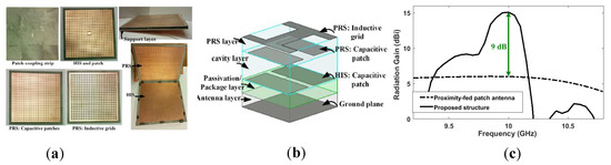 Configuration of the RCA in [153]: (a) Fabricated MEFSS cover; (b) MEFSS unit cell; (c) Radiation gain of the main radiator with and without MEFSS cover.