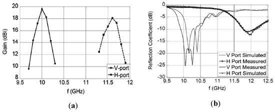 Multi-band high-gain antennas are highly required for the next communication systems. The capability of the RCA structures to possess the multi-band characteristic has been extensively investigated in the literature [156,158,159,160,161,162,163]. Generally, creating different resonances that satisfy the resonance conditions is the way to design multi-band RCAs. In Reference [159], a dual-band high-gain RCA with two vertical and horizontal polarizations is proposed. A dual-feed microstrip patch antenna is used as the main radiator, which has dual-band and dual-polarization characteristics. A PRS composed of double-layer orthogonal dipole arrays to create V-pol and H-pol is placed above the main radiator. The RPS unit cell is designed so that the resonance condition is satisfied over two different frequency bands with orthogonal polarizations in order to improve the radiation characteristic of the RCA. The configuration of the main radiator and PRS are shown in Figure 19. The lower band and upper band have a maximum gain of 19.6 dBi and 18 dBi at 10 GHz and 11.6 GHz, respectively, as shown in Figure 20. The polarization of the RCA is vertical and horizontal at lower and upper frequency bands, respectively.