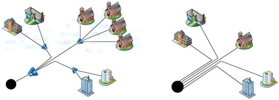 Many current solutions specify how to terminate optical fiber at an end-user, and FTTH is not considered to be the only solution. Generally, fiber to the x (FTTx) is the name of the convention, where the letter “x” expresses a technology. FTTH is only a part of the generalized term FTTx, and these technologies are very popular and frequently deployed; Internet services providers (ISPs) have to find a trade-off between price and penetration []. For example, for fiber to the building (FTTB), optical fiber is installed in optical splice boxes in buildings, and then, different transmission mediums (such as copper wire) are used to carry the signal into customer apartments. Other solutions employ edge boxes (e.g., switches or routers) in a building that are powerful, small and have low power consumption. These boxes provide optical interfaces with optical cables that reach individual apartments equipped with equipment that have optical receivers and usually use Ethernet for services such as Internet protocol television (IPTV).