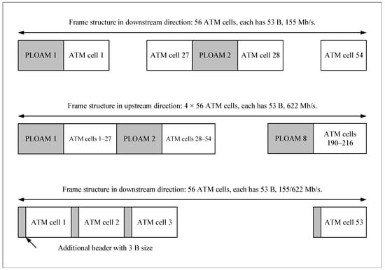 The structure of the APON frame is shown in Figure 3. The frames sent in the downstream direction vary depending on the transfer speed, while the frames sent in the upstream direction remain the same for the symmetric and asymmetric variants.