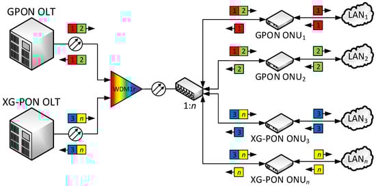 The first mention of optical fibers usage in passive access networks was published in 1987 by Stern and colleagues []. The change in the transmission medium from copper to silica fiber required the connection of active devices to provide the conversion of optical signals to electrical signals, which is not used in contemporary PONs.