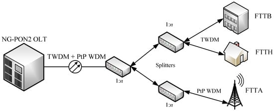 - G.989.1: 40-Gigabit-Capable Passive Optical Networks (NG-PON2): General Requirements. Available online: https://www.itu.int/rec/T-REC-G.989.1/e (accessed on 2 June 2020).