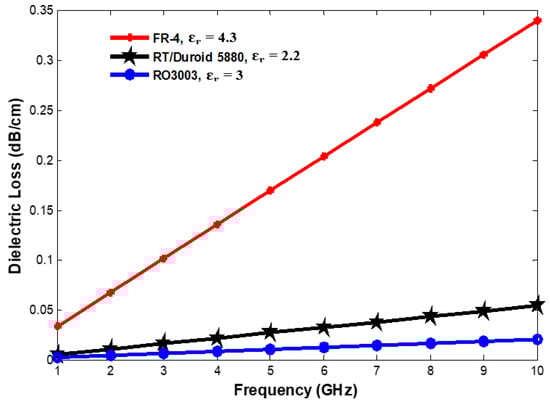 The filtering antenna was established on three different types of dielectric substrate material, which are FR-4, RT/Duroid 5880, and RO3003. Firstly, these substrate materials were kept at a fixed thickness, and then the thickness of each dielectric substrate was changed to investigate which of these three types is more suitable for the specifications of a certain application. The absorption of electrical energy by a dielectric material that is exposed to an alternating electric field is called dielectric loss.