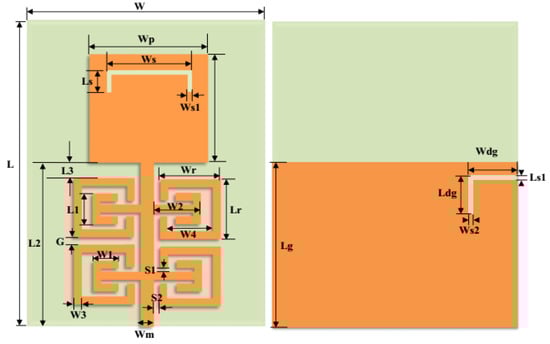 The layout of the proposed filter-antenna structure is shown in Figure 1. The design consists of a four-pole band-pass filter (BPF) and a monopole patch antenna. The integration of the BPF with the monopole patch antenna is realised by connecting the second port of the BPF with the antenna. A 50-Ω microstrip transmission line is used to feed both the BPF and monopole patch antenna, so there is no need for an additional matching circuit, and so the size of the configuration is reduced. The four-pole band-pass filter is mainly composed of four resonators, which are connected to the microstrip feed-line established on a dielectric substrate material. The ground plane of the filter-antenna design has an L-shaped slot etched, as shown in Figure 2. Also, each resonator consists of a square open-loop ring with a longitudinal stripline ending with E-shaped arms. Therefore, a compact structure has been achieved with this configuration.