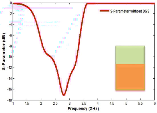 Etching the DGS in the ground plane of the filter-antenna disturbs the current field distribution in a waveguide structure. This disturbance will affect the parameters of the design, such as the effective capacitance and effective inductance [43]. The feature of DGS is a slow-wave impact due to the equivalent LC components that may decrease the designed circuit size [44]. Figure 7 shows the simulated frequency response of the proposed filter-antenna design without a square open-loop ring resonator (SOLR).
