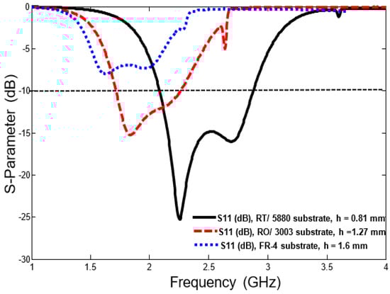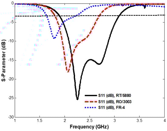 Comparison of S11 for different dielectric substrate materials at h = 0.81 mm.