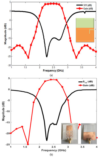 Figure 10 shows the simulated and measured reflection coefficient (S11) and gain for the proposed filter-antenna with the practical realisation for the prototype, which is fabricated using RT/Duroid 5880 dielectric substrate with a height of 0.81 mm and a dielectric constant of 2.2. The structure is printed on a compact size of 0.32 λ0 × 0.30 λ0, where λ0 is the free-space wavelength at the centre frequency. From Figure 6, Figure 7, and Figure 10, it should be noted that there is a significant and noticeable effect of the DGS and the SOLR on the overall performance of the filter-antenna response. The designed filter-antenna operates at a centre frequency of 2.4 GHz and has a relatively wide-band impedance bandwidth of about 1.22 GHz and a fractional bandwidth (FBW) of about 50%. The measurement results show the design also has a maximum realised gain of 4.9 dB at the operating frequency.