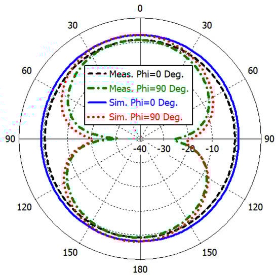 Moreover, Figure 11 shows the simulated and measured far-field radiation patterns of the proposed filter-antenna design at a centre frequency f0 = 2.4 GHz. It is clear that the design offers stable and good radiation patterns at phi = 0 and 90 degrees. The simulation results from the CST simulator and the measurement results from the vector network analyzer (HP 8510C) and the anechoic chamber [41] show a reasonably good agreement.