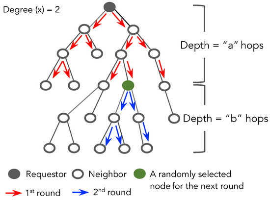 The policy for propagating the query in multiple rounds is described as follows. Firstly, the number of regions required is initialized by a requestor. Then the hop distance would be calculated using Equation (3) in the function calMaxHops(). For example, the requestor assigns the number of regions as k regions, the hop distance can be calculated as “a” hops, and then queries are sent randomly to neighbors within “a” hops. When a node at depth “a” receives and processes the query, it will store the query temporarily (and not forward it). The query therefore becomes frozen at all nodes at “a” hops from the requestor. Meanwhile, the requestor will receive the responses from the regions that have processed the query. If the number of positive regions has been satisfied, then the algorithm terminates; otherwise it will start the next round, initializing a depth “b” (re-calculating the hop distance from the number of found regions, shown in Algorithm 3). In the next round, only one node at depth “a” is selected randomly (calling the function selectOneNeighbor(N)) that will forward the query along its path within “b” hops. The process continues in a similar fashion to other levels in the network until the value expires or the number of regions required is obtained.