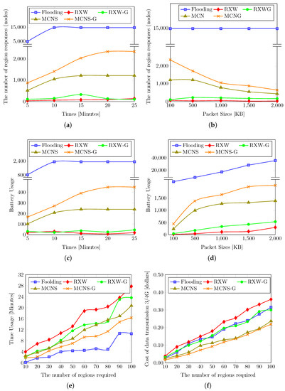 In addition, the performance of RXW is viewed as the poorest with the smallest number of regions found while requiring a long time period to search its neighbors, thereby incurring higher transmission costs in spite of using relatively less battery power. The result can be explained by the impact of the randomized method used for finding neighbors. This method may limit the probability of finding neighbors active in task forwarding, thereby resulting in queries being repeatedly submitted. Furthermore, compared to RXW, the RXW-G approach was found to take less time and have a lower cost for query sending. It seems possible that this result is due to the potential of , which can distribute more queries in a round, leading to a higher probability of finding the required number of positive regions and reducing costs incurred.