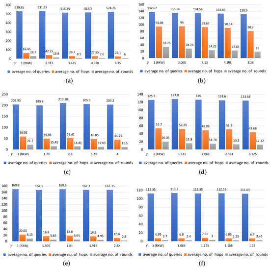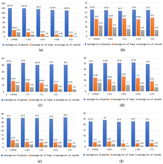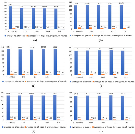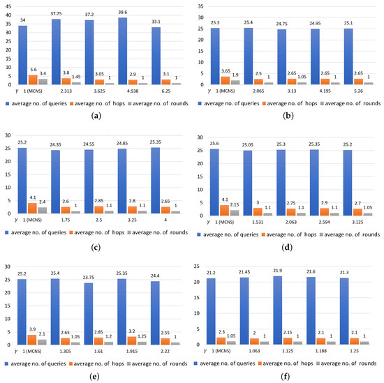- The smaller was, the more queries, hops, and rounds were needed, For example, with = 0.16, 0.32, 0.81 in Figure 7a,c,f and with = 1, increasing the values of led to a slight drop in the number of queries (34, 25.6, and 21.2 queries, respectively). Under the same conditions, the average number of rounds taken to find the targeted regions were 3.4, 2.15, and 1.05 and there was a decline in the average number of hops to 5.4, 4.1, and 2.3, respectively.