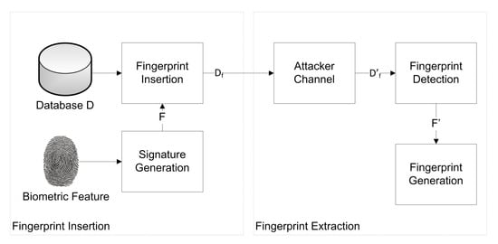 Now when the data breach occurs, it is important to identify the guilty agent responsible for this breach. This can only be possible if we are able to distinguish between the guilty agent(s) and the innocent users. Fingerprinting of digital data provides one such mechanism and has quite widely been applied in different data formats [1,2,3]. However, fingerprinting of relational data has still lots of room for new research. In Reference [4], the pioneer work on fingerprinting of relational databases was proposed by Li et al. by extended the watermarking technique of Agarwal et al. presented in [5]. The technique in [4] works by embedding the buyer-specific bit string in the relational data such that these bits can be used to distinguish among the copies of the same data. As a result, the specific buyer whose data were leaked can be identified. Some recent works presented in [6,7,8] use different bits for identifying the different users of the data. However, these techniques do not provide any mechanism to associate the mark bits used for fingerprinting to the relevant user to a biometric feature of the user. The use of a secure but random bit sequence might sometimes result in an error in the identification of the guilty agent. For example, among three recipients with signatures 10010, 10011, and 10101, recipient 2 with signature 10011 is the culprit leaking the data, but if his bits match to user 1 by changing of only one bit after the attack, the recipient 1 will be traced as the culprit. Therefore, it is imperative that we use more unique features to get more accurate results.