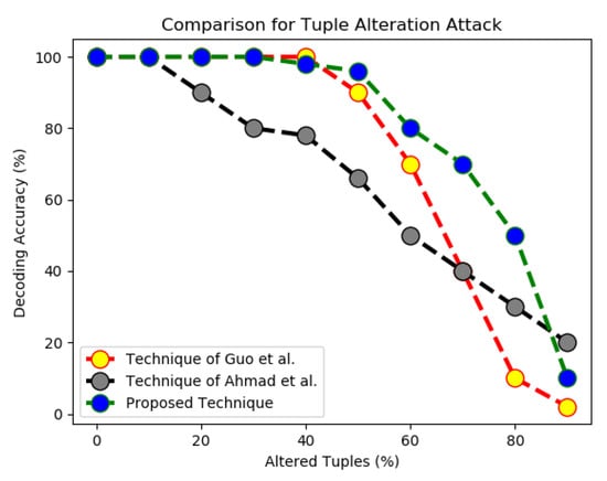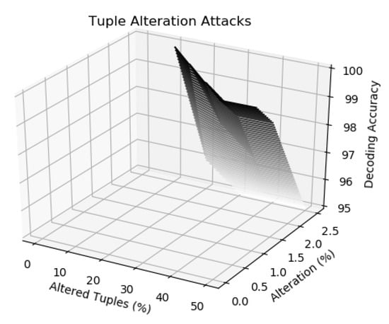 Alteration attack is the one in which Mallory changes the values of the tuples in the fingerprinted data in order to disturb embedded the fingerprint bits. In this attack, he may change the values of ℵ number of tuples but our technique is strong enough to overcome this problem. We also examined the robustness of our technique if the attacker alters up to tuples for destroying inserted digital mark (signature) and found out that it shows resilience against these attacks and achieves 100% accuracy when up to tuples are attacked and a decoding accuracy of when up to tuples are attacked as shown in Figure 4.