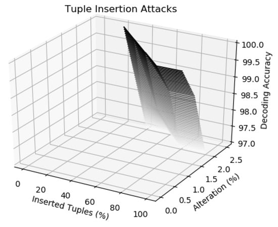 In this attack, Mallory wants to corrupt the embedded fingerprint in the dataset of Alice to affect the identity of the data recipient. There are two options for Mallory while inserting new records: (i) insert similar records in the fingerprinted dataset by replicating the tuples in the dataset (we show this by 0% alteration in Figure 5); (ii) insert new tuples but with some slight different values than the tuples in the fingerprinted dataset (we show this by 0.5% to 2.5% alteration in Figure 5). Again, our scheme also showed robustness against these attacks as depicted by decoding accuracy in Figure 5 because inserting of new tuples does not affect the fingerprinted tuples that are still present in the dataset. Accordingly, Alice can extract the inserted fingerprint from these fingerprinted tuples.