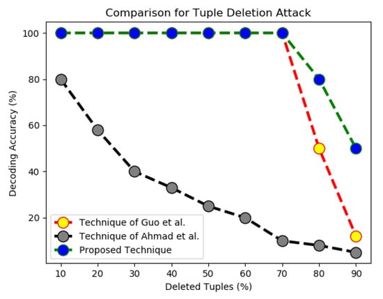 For comparison, let us consider the subset selection attack first. In such attacks, the attacker, Mallory selects subset of the marked dataset to make a new smaller dataset. In other words, he virtually deletes the remaining dataset with the aim to disturb the inserted fingerprints from the fingerprinted dataset, by selecting some records. The technique of [21] provides 100% decoding accuracy up till 10 to 70% of deleted records and their accuracy decreases to as compared to our accuracy of after deletion of of tuples from the marked dataset. Similarly, our technique outperformed the technique of [21] when up to of the tuples were deleted from the marked dataset. We believe that this is due to the fact that we did not use any particular bit for fingerprint insertion in a particular data partition because such techniques become dependent on marked bits during decoding process; consequently, changing of only one bit can disturb the embedded fingerprint. Similarly, the proposed technique also outperformed the technique of Ahmad et al. that uses fake tuples for fingerprint embedding while the proposed technique does not have any such dependency on fake tuples. The results of these experiments have been shown in Figure 6.