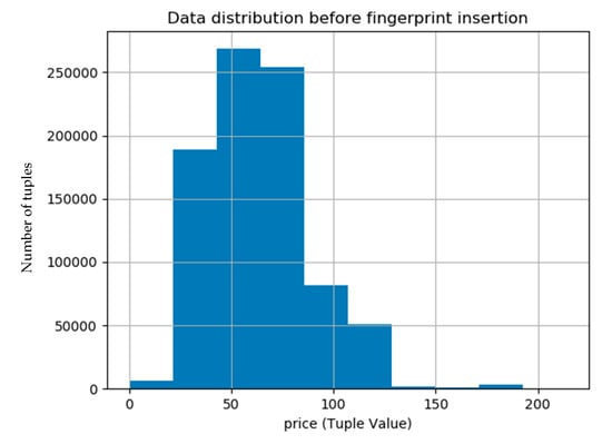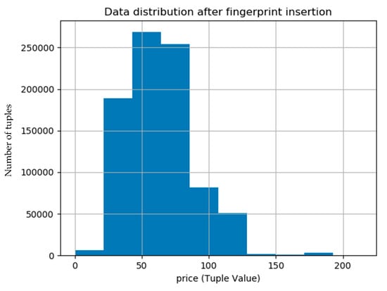 The data distortions that result due to fingerprint embedding are controlled by usability constraints. These usually constraints are usually defined by the data owner based on sensitivity of the data and its intended use. Ideally, these distortions should be minimum and our proposed technique makes sure to minimize these data distortions by preserving the usability constraints. Moreover, the use of machine learning technique, linear regression, for computing the threshold for data modifications during fingerprint embedding also helped to keep the data distortions to a level where usability constraints are not violated. The histograms shown in Figure 9 and Figure 10 show that the data distribution in the original and the fingerprinted data is almost same.