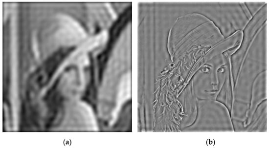 De-high and De-low frequency images of Lena: (a) low frequency components; (b) high frequency components.