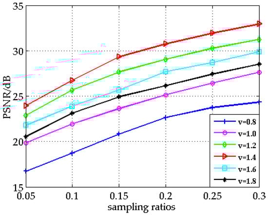 The optimization of the parameters plays a vital role in image processing to obtain satisfied reconstructed results within acceptable time. Fractional-order differential operators can enhance high frequency components comparing with integer-order differential model. We analyze the effect of the parameter v on reconstruction performance to get the best quality. The image Barbara is used to evaluate the performance at 30% sampling ratios and several different fractional orders are chosen. The results are shown in Figure 3 and Figure 4. For each v, we obtain the reconstructed images and the residual images. It is obviously that when , images reconstructed by the proposed method lost many texture details and the contour can be seen in residual images. When , this method computes the integer order gradients and cannot preserve details effectively. When , high frequency components are enhanced and reconstructed images have better visual effects. We cannot see the contour in residual images. However, when v is close to 2, PSNR reduce significantly and reconstructed images are fuzzier because texture details are enhanced excessively and become the noise. To obtain the best results, we set in our experiments.