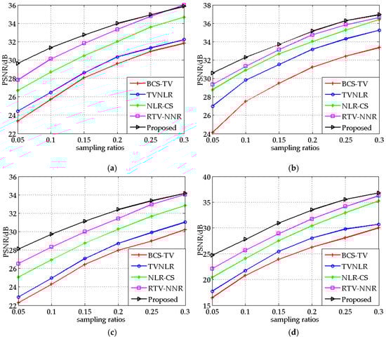 In our experiments, a Gaussian random matrix is used as a measurement matrix. We select the most appropriate parameters as follows: , , , , , , , empirically. The Lagrangian multipliers a, b, c are initialized to zero matrices. The proposed algorithm is compared with four algorithms, i.e., BCS-TV [], TVNLR, NLR-CS, RTV-NNR. We obtain the experimental results at various sampling ratios (5%, 10%, 15%, 20%, 25%, 30%). All the experiments are performed on the Lenovo computer with Inter(R) Core (TM) i5-10210U CPU (1.6 GHz) and 16 G memory, running Windows 10 and Matlab 2012a.
