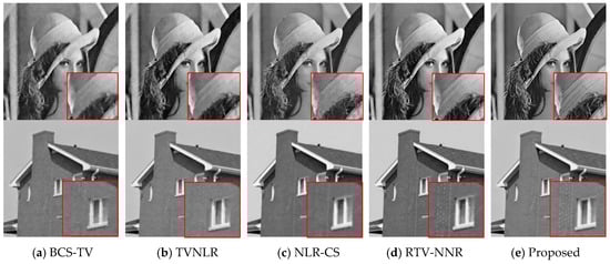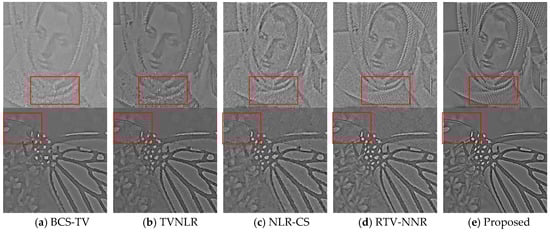 Intuitively, the visual results of the two images are shown in Figure 6 and the residual images (difference between original images and estimated images) are shown in Figure 7. Selecting portions of reconstructed images in red boxes and enlarging them, we compare them at 5% sampling ratios to appear significant differences. The quality of images reconstructed by BCS-TV and TVNLR are much worse than from the other three algorithms. Many block artifacts can be seen in Figure 6a,b. From Figure 7a,b, the smooth regions are preserved well but the texture details are lost a lot, therefore BCS-TV and TVNLR have bad visual effects. Images reconstructed by NLR-CS are better and have better visual effects. But this algorithm suffers from over-smoothed effects owing to the average tendency of different similar patches. Our proposed algorithm has the best visibility compared with other algorithms in Figure 6. This method preserves image texture details and eliminates staircase artifacts by using the fractional-order differential method and nonlocal regularization. We can hardly see the intact contour in residual images in Figure 7e. Experimental results demonstrate that our proposed method enhances high frequency components (image details) significantly.