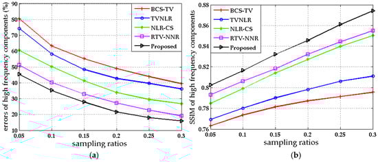 The average relative errors and SSIM of high frequency components with different ratios: (a) average relative errors of high frequency components, (b) average SSIM of high frequency components.