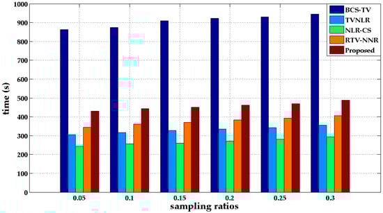 It is clear that our proposed algorithm preserves the most textures in Figure 8 and we can see the complete edge contour. The other four algorithms lost many details, resulting in the terrible visibility in Figure 8. Furthermore, we compare the average relative errors and SSIM of texture details in Figure 9. For every image and sampling ratio, our algorithm has the smallest relative errors and the best SSIM of high frequency components. These results demonstrate that our proposed algorithm enhances the texture details significantly. Compared with other methods, our algorithm lost some low frequency components, but fortunately it has little effect on the visibility of images. We also compare the average reconstruction time at different sampling ratios in Figure 10 and it is shown that our algorithm costs a little more time than TVNLR, NLR-CS and RTV-NNR, but less than BCS-TV, which we will improve in the future.
