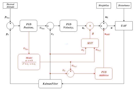 Without the proposed adaptive controller, the altitude of the existing UAV is controlled by a cascaded PID structure. The outer controller uses the desired altitude and the current altitude to set the desired velocity , which is used in combination with the current vertical velocity by the inner controller to calculate the needed control output . This output is added to a constant HeightGas , which is the gas needed to counter the gravitational forces on the UAV. The position and velocity of the UAV are calculated by fusing different sensors in a Kalman Filter. Figure 3 shows the previous existing implemented control structure for the altitude of the UAV.