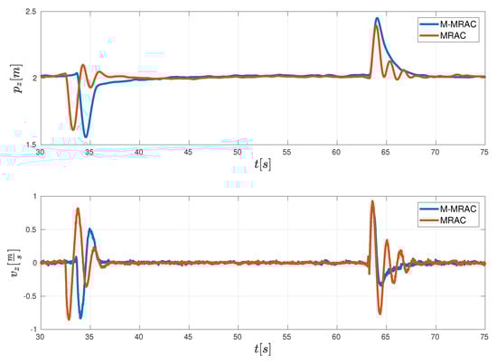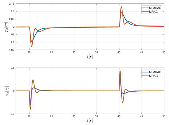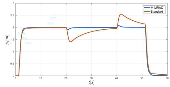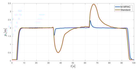 To compare the performance of the used M-MRAC with the previous existing control structure, both controllers were commanded to perform the same procedure as in Section 5. First, the altitude controller was set to reach and hold an altitude of m. Next, a mass of g, which is more than half the weight of the UAV, was attached to the drone at s and released at s.
