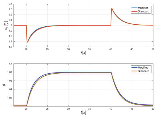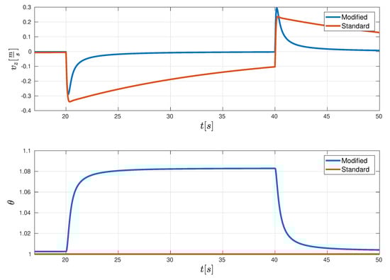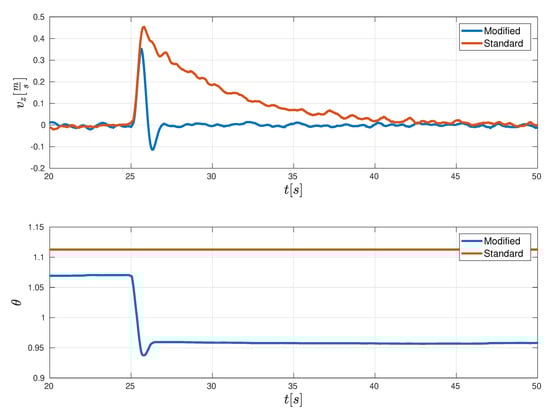 Lastly, the proposed modifications to the MIT-rule with MRAC are compared to the original version. As described in Section 3 the motivation for the proposed changes is the problem, which occurs when the reference value is set to . In our implementation (see Section 4) the reference value is described by the reference velocity , which is in turn given by a transfer function using the desired velocity . To better show the resulting error of these special conditions, the models were simulated for two different scenarios and . Both models where only controlled by the inner PID controller for the vertical velocity. Again at s a mass of g was attached to the simulated model and released at s for both controllers.