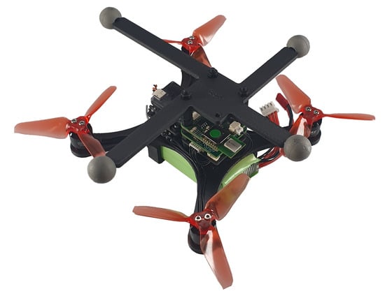 The micro-UAV as seen in Figure 8 was developed at the University of Wuerzburg [24]. The autopilot software on the flight controller runs on a cortex M4-processer using the Real-time Onboard Dependable Operating System (RODOS) [25]. The UAV has a mass of g with a footprint of 15 cm × 15 cm and the following, for this work related, components: